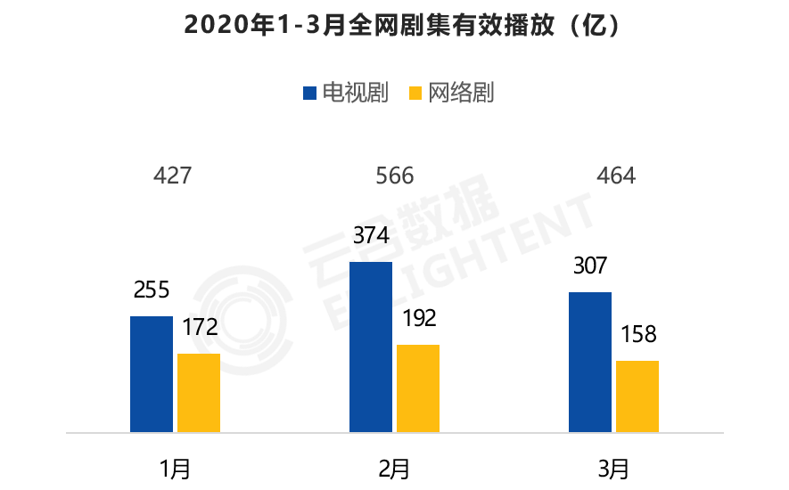 而在增长的播放量里,2月扛起了最多的流量——2月全网剧集有效播放566亿,占Q1总量的40%。而2月正是大家居家隔离,广泛开始线上娱乐的日子。居家隔离带动的不仅是网上的流量,还有电视端的数据。据广电视听大数据,2月电视剧日户均观看时长较1月份提升30.6%。