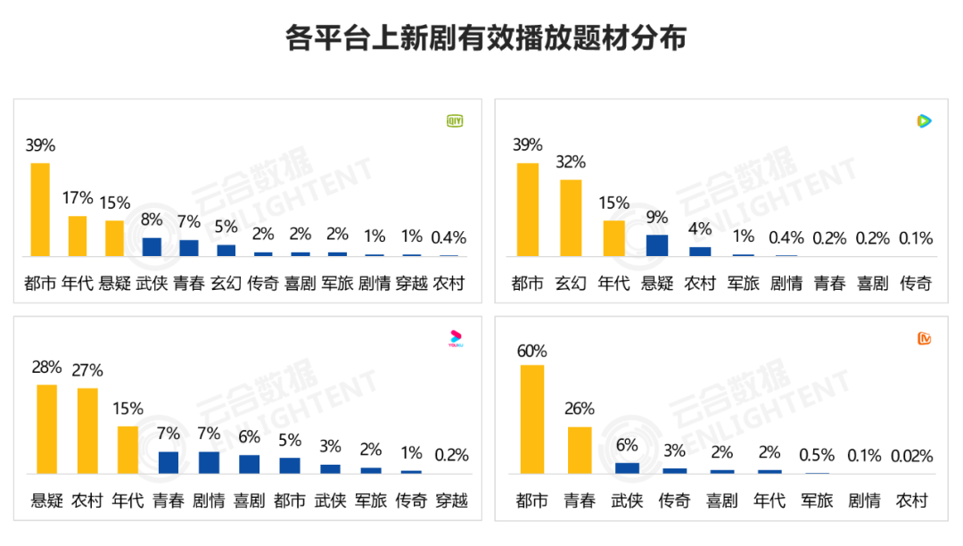 而悬疑题材剧也是Q1各大平台流量占比颇高的一个种类。据云合数据显示,一季度悬疑题材在优酷的有效播放占比达28%,是占比最高的题材。悬疑题材在爱奇艺和腾讯的有效播放占比则分别在第三、第四。