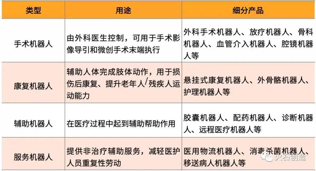 根据国际机器人联合会(IFR)分类,医疗机器人可以分为手术机器人、康复机器人、辅助机器人、服务机器人四大类,具体的用途和细分产品见表1。
