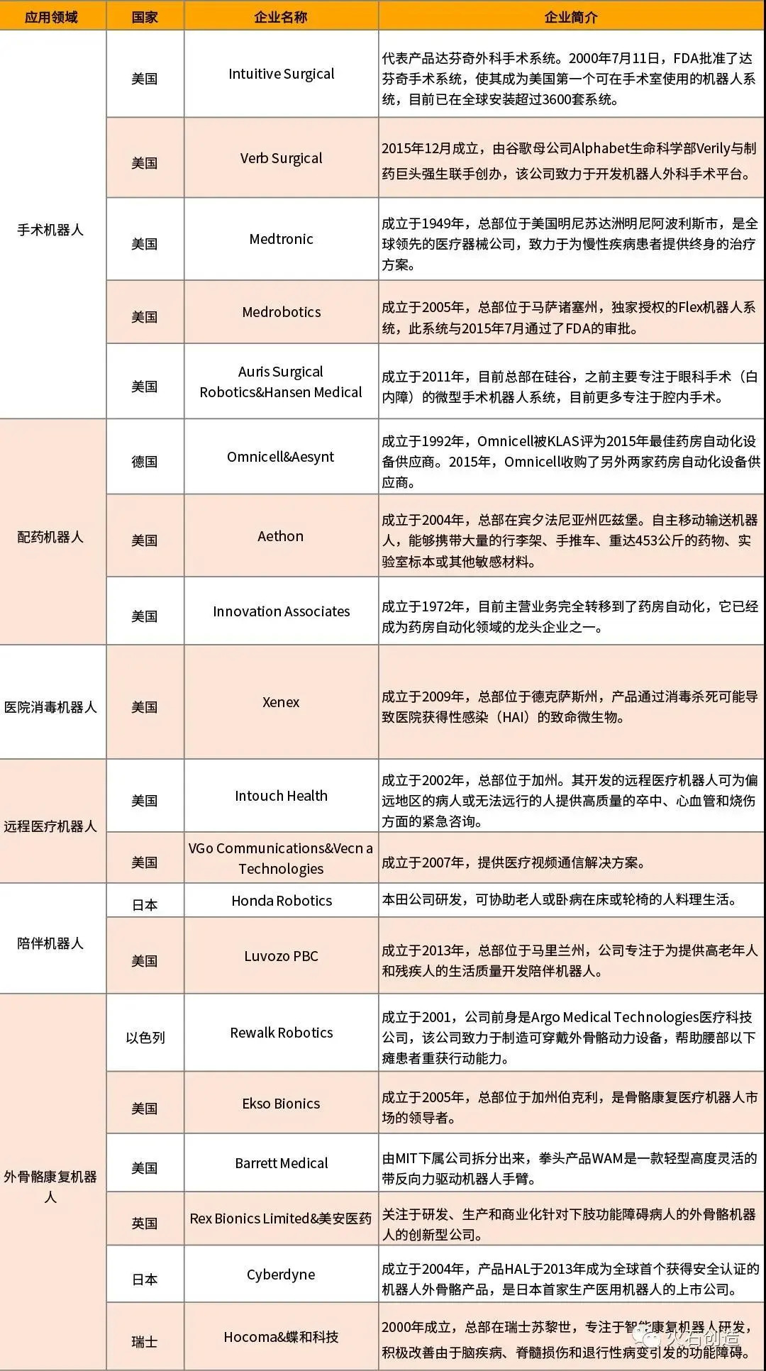 现阶段医疗机器人的发展以美国企业为引领和代表,德国、日本紧跟其后。美国直觉外科公司(Intuitive Surgical)的达芬奇手术机器人是手术机器人的代表,处于行业绝对垄断地位。在外骨骼机器人和远程医疗机器人领域,日本的Cyberdyne和Honda Robotics两家公司位于行业前列。在配药机器人和外骨骼机器人领域,德国和以色列企业具有一定优势。