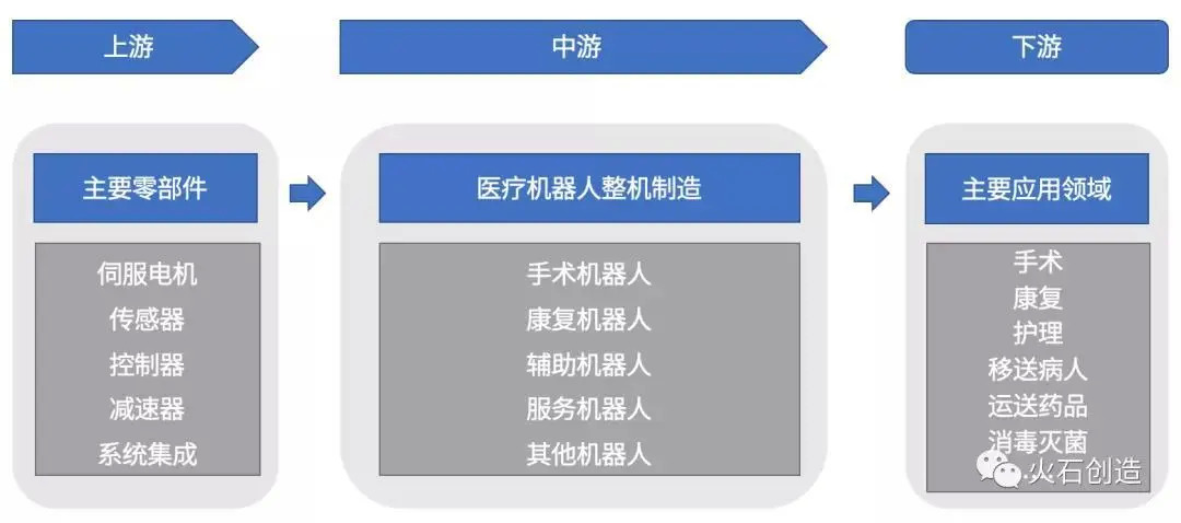 医疗机器人产业链的上游为机器人零部件,主要由伺服电机、传感器、控制器、减速器、系统集成构成;中游为医疗机器人整机的生产制造;下游供给于智慧医疗市场的需求端,主要应用于医疗的手术、康复、护理、移送病人、运输药品等领域。