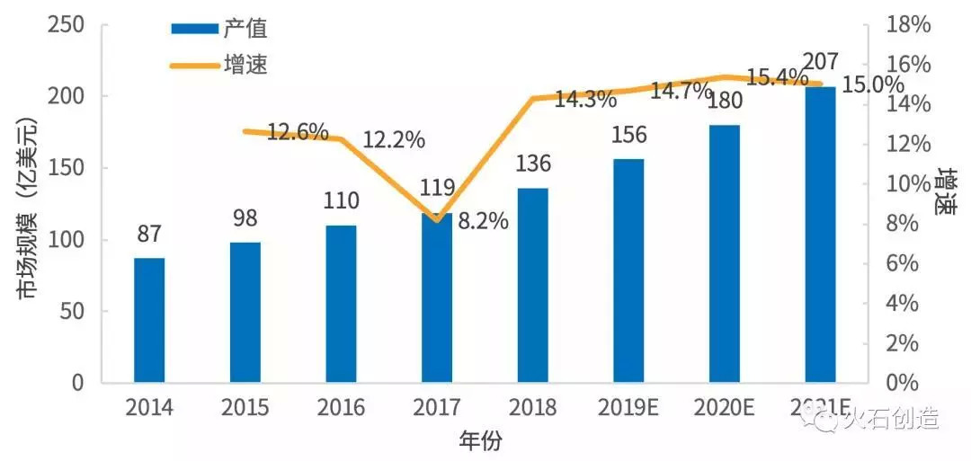 图2 2014—2021年全球医疗机器人市场规模及增速