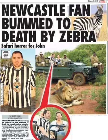 最终这个以荒诞开始的故事有了一个悲伤地结局,这位球迷在对雄斑马怒吼时被误以为是在性挑衅,于是那匹遭到侮辱和挑衅的斑马如同发狂一般,报复击中了他。