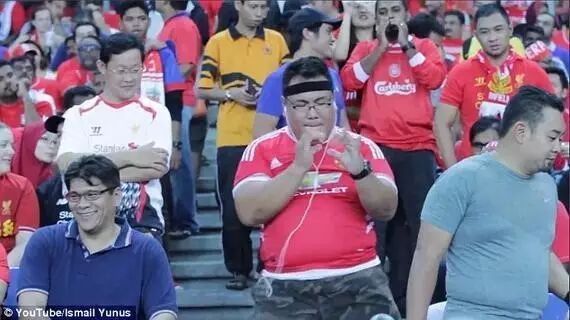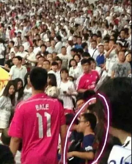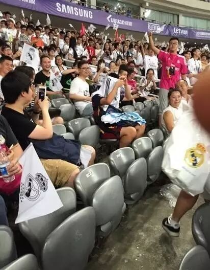 巴萨皇马算是死敌了吧!美凌格和巴萨球迷从来就没有正眼瞧过对方,而这位巴萨球迷不知是不是买错了球票,竟然一身红蓝出现在皇马中国行的皇马白色海洋中,真是!可悲!可叹!可敬啊!