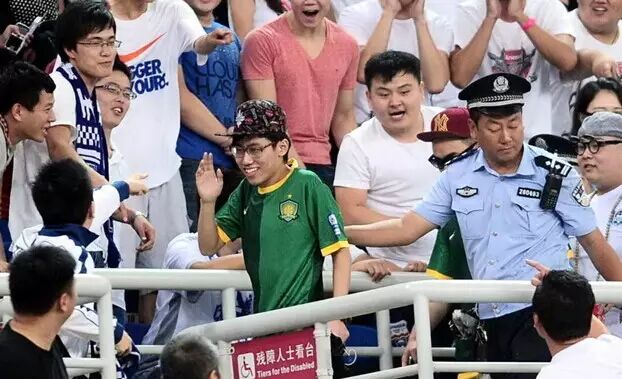 不过,虽然球迷走错看台穿错球衣总会出现点纠纷,可在石家庄永昌的球迷看台上还是让我们看到了这样温馨和睦的一幕,一名亚泰的球迷与身旁的石家庄人和谐相处,简直是富强民主文明和谐的代表作呀!