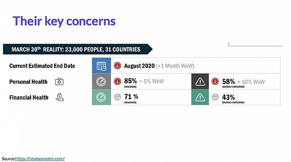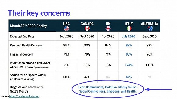 而纵观国际不同国家的人们,对于疫情之中和接下来3个月最关心的角度还有:恐惧、隔离限制、孤立无缘、维持生存的经济支持、社会连接、情感和健康。