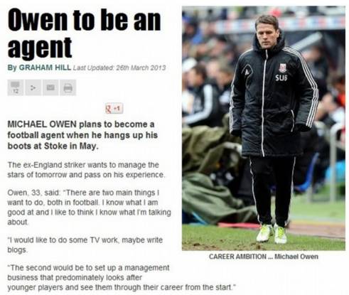在他退役的时候,曾很苦恼过自己未来该怎样,会从事什么样的工作。当时有传闻称英格兰队打算招揽他进去辅助霍奇森,也有好几家电视台打算邀请当评球嘉宾。而生意头脑发达的欧文(不愧是金童,曾经的他可是英格兰球员富豪榜的第三名)表示,他还会考虑开一个球员经纪公司,他当时说:“去足球媒体让我感兴趣,我现在和几家广播商谈判,并且希望签下一份从下赛季开始的合同,我也打算开一家球员经纪公司,为年轻球员提供职业生涯规划和建议,我真的希望带着一些我们最好的天才让他们的职业生涯走向成功。”