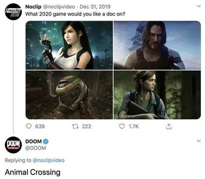 而《毁灭战士:永恒》则选择与自家画风大相径庭的“动森”搞联动。在正式推出游戏之前,DOOM开发商ID工作室的总监HugoMartin曾表示非常期待可以玩“动森”, DOOM也在官方推特上表示2020年最想玩的游戏就是动森,甚至出现了“猛男玩动森,萌妹玩DOOM”的联动宣传语。