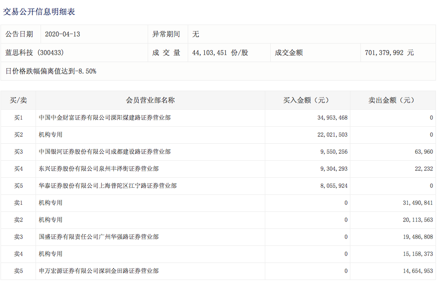 盘后数据显示,蓝思科技因日价格跌幅偏离值达到-8.50%登上深交所龙虎榜,当日成交金额7.01亿元,机构买卖频繁,一机构专用席位今日买入2202.15万元,三个机构专用席位合计卖出6676.3万元。