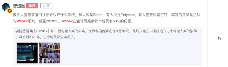 但是中国媒体更加喜欢拿ZOOM与Webex对比,以及对ZOOM袁征曾经入职Webex十四年这段经历讨论度更高。