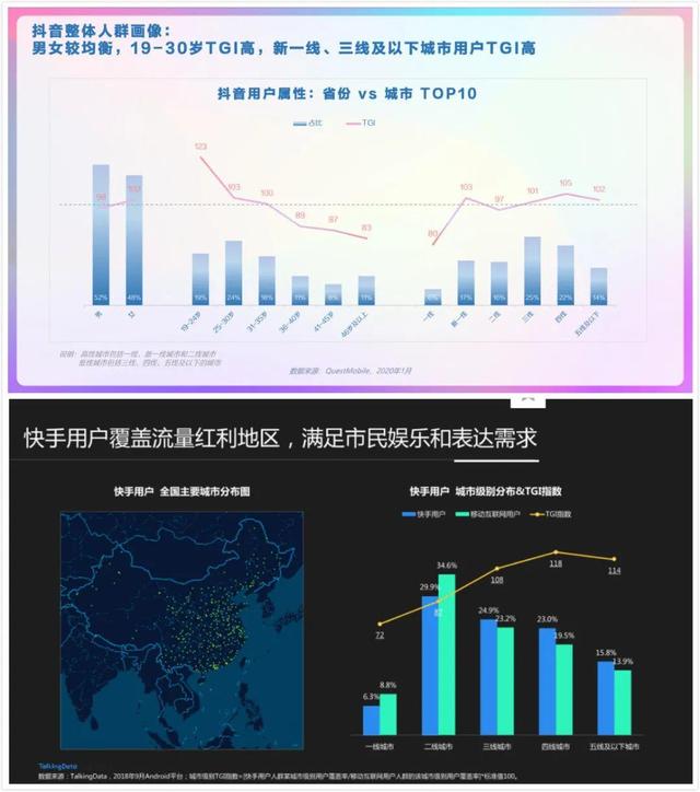 而根据《巨量算数抖音用户画像》(2020年2月)、《TalkingData-快手用户人群洞察报告》及相关资料显示,抖音、快手的主要用户年龄均偏年轻化且三四线及以下城市占比分别为61%、63.7%,月收入5000元以下的用户群体分别占比为61%、74%,本科以下学历占比分别为59%、69%。小镇青年、中低收入群体是当下短视频平台用户的主力军。