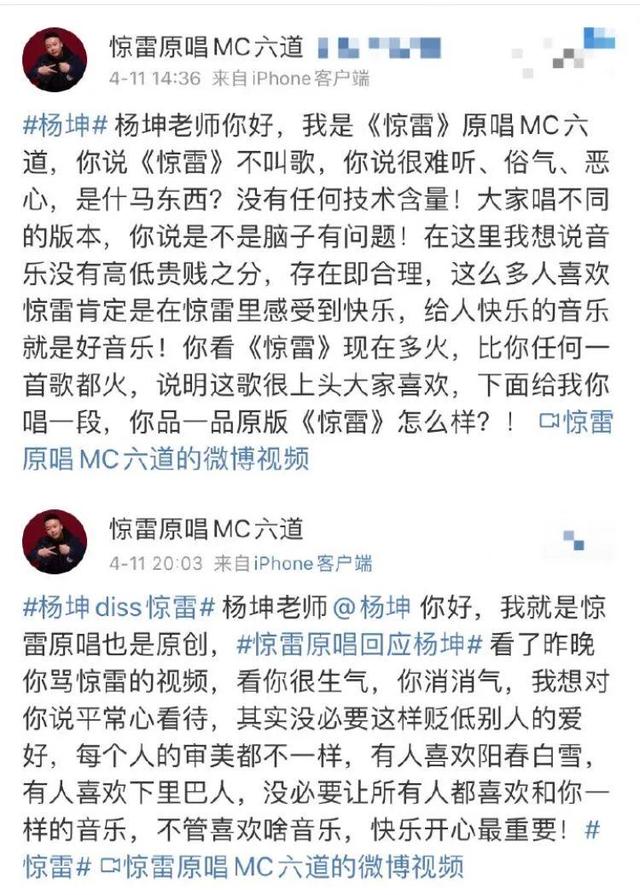 4月10日,杨坤在直播间点名批评《惊雷》“要歌没歌,要旋律没旋律,要节奏没节奏,要律动没律动”,评价其“难听”、“俗气”;4月11日,MC六道以原唱者的身份视频回应,称《惊雷》现在比杨坤的任何一首歌都火,且认为每个人的审美都不一样,“汝非鱼,安知鱼之乐”,认为杨坤没有必要贬低他人的兴趣;4月12日,MC六道微博发文,对于杨坤批评《惊雷》事件进行梳理、汇总,而晚些时候,杨坤则再度回应对《惊雷》的态度,认为“咖啡呢,我也爱喝,大蒜呢,我也爱吃,但是《惊雷》就算了”,并呼吁不要浪费公共资源。