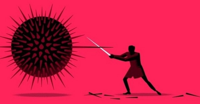 在《纽约客》的另一幅插图中,尼曼将病毒外膜上的蛋白质表现为致命的尖刀,需要人类击退。