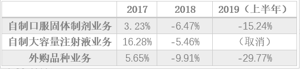 其中,自制口服固体制剂业务虽然毛利率均保持年增长高于10%,也难捱业务营收的不断下滑。2019年上半年,*ST天圣的自制口服固体制剂业务营收下滑15.24%。