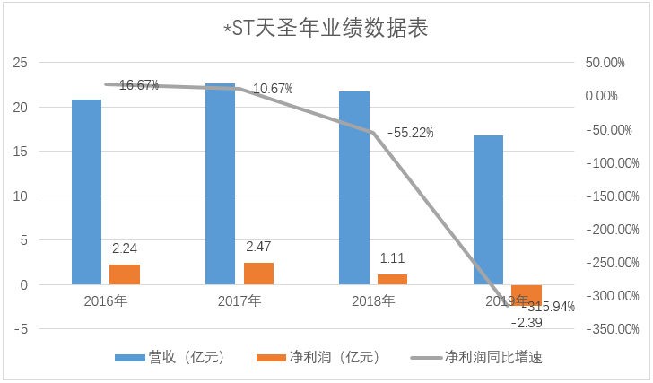 四年来,*ST天圣仅在2017年挂牌上市当年,录得2.49亿净利润,同比增长10.73%,此后便迅速变脸。2019年业绩快报显示,*ST天圣预计实现营收16.77亿元,同比下滑22.79%;归属于上市公司股东的净利润亏损2.15亿元至2.65亿元,同比下滑315.94%。