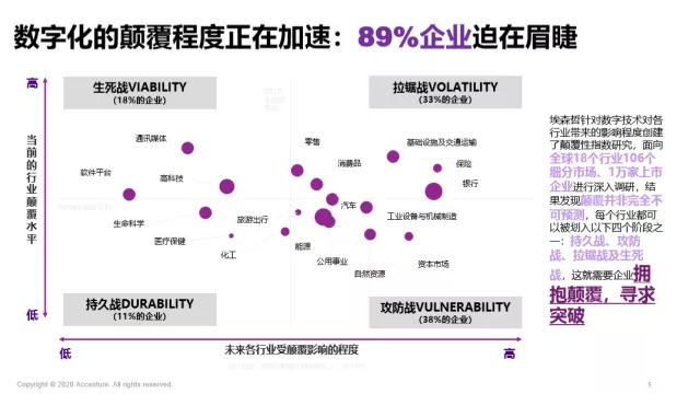 接下来,我给大家介绍数字化对不同行业的颠覆指数。埃森哲针对全球18个行业,细分为106个细分市场,大概是1万家上市企业展开调研,发现89%的企业数字颠覆程度正在加速,企业转型迫在眉睫。
