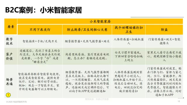 我们再看一个小米智能家居案例。小米将智能手机与智能插座、传统家居场景联系在一起,形成了电量统计、定时、遥控开关等等一系列的智慧解决方案。这些 场景再造的方案不仅令顾客降低成本,更重要的是提升顾客体验,能够让我们改造这个世界,让数字技术变得更加人性化。