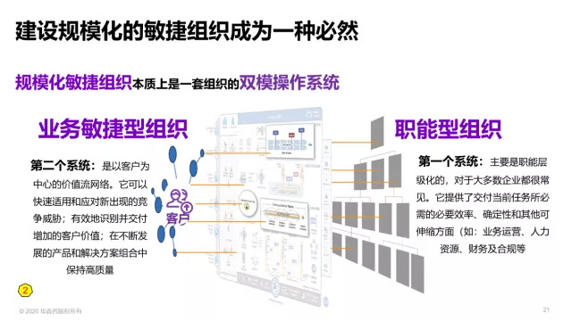 但是,数字经济时代需要快速响应客户需求、快速变化。这个时候,需要我们建立起第二套组织模式/或操作系统,我们叫做“业务敏捷型组织”。它是以客户为中心的价值流网络。