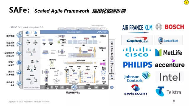 那么,这样“规模化敏捷组织”是不是我们假想的呢?不是的。其实,已经有一套完整的成熟方法论工具,即:SAFe(Scaled Agile Framework)在很多企业开始推行。