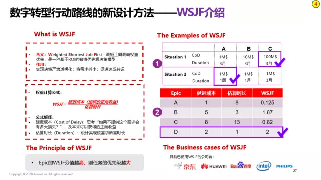 目前,采用WSJF做优先级排序的公司很多,像京东、华为、百度、英特尔、飞利浦等等,都在采用这种方法来取代传统需求优先级排序。