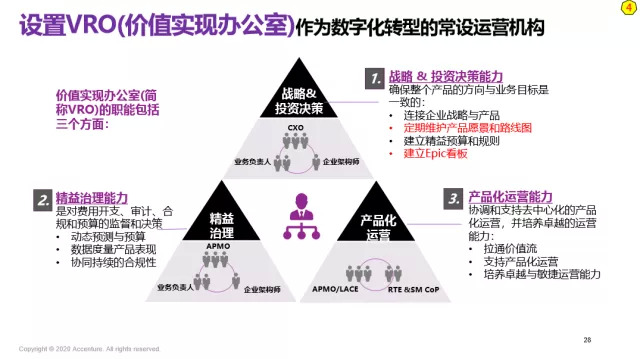 一,战略与投资决策能力:让公司所有的数字化产品的投资与战略对齐,VRO是连接企业战略与数字化产品的一个桥梁。这是一个常设机构,持续维护产品的愿景和数字化转型路线图。VRO负责拉通业务和IT部门,并对他们的需求进行进行优先级排序。它是一个动态的数字转型行动路线图维护部门