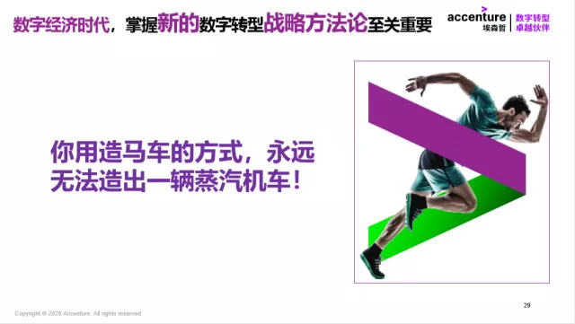 埃森哲的数字化转型的方法论FORM。这是一个什么样的方法论呢?我们可以从三个方面来看埃森哲对于整个数字经济时代方法论再造的思考。