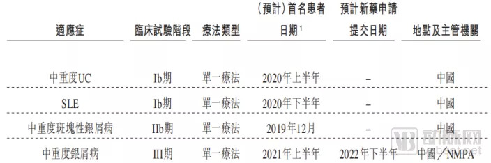 AK101目前正在进行中重度斑块状银屑病的Ⅱb期临床研究,同时针对中重度溃疡性结肠炎(UC)和系统性红斑狼疮的临床试验也将于2020年陆续开启Ⅰb期临床试验。