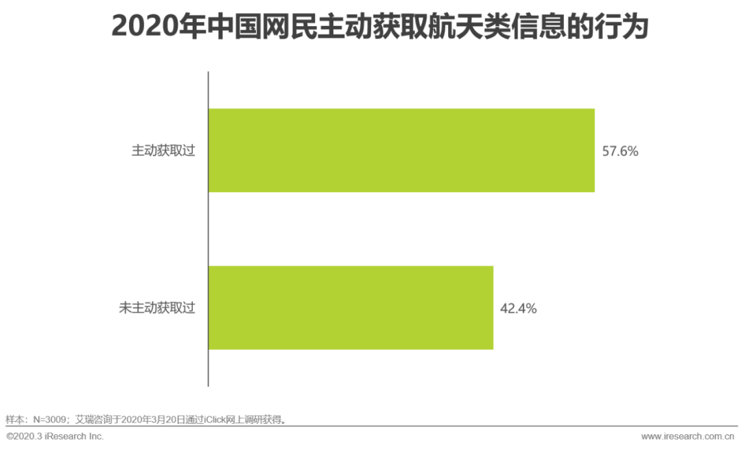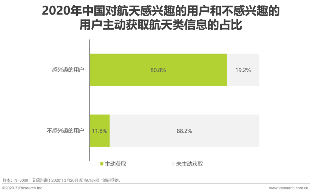 在所有被访对象中,过去一年中主动获取航天类信息的占57.6%,这与全社会对航天的感兴趣程度相吻合。但对于感兴趣和不感兴趣的两类群体而言,其行为差异巨大。在感兴趣的群体中,超过80%的人在过去一年中主动获取过航天类的信息,而不感兴趣的人这一比例仅有11.8%。