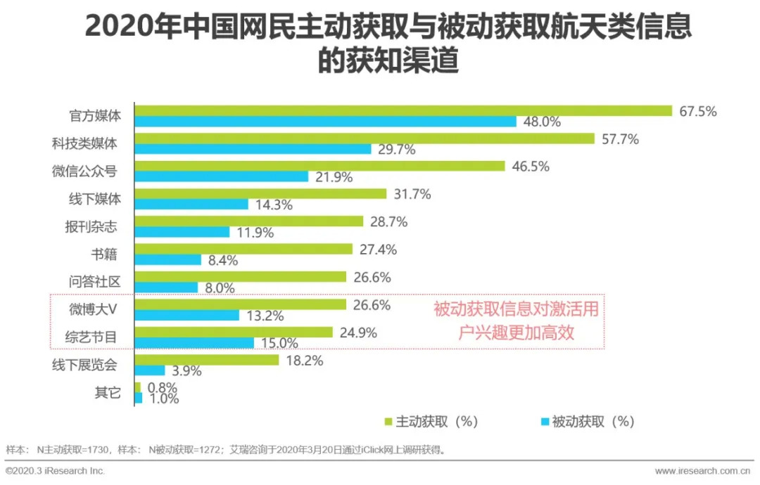航天产业在中国有着不同的意义,相比于其它民用级科技行业,航天体系比较封闭。所以在国内,官方媒体是用户主动选择与被动选择最多的渠道。与航天技术密集型属性息息相关的科技类媒体,以及当下流量巨头微信公众号,也都是大众获知航天信息最重要的渠道。这些渠道在航天产业的宣传渠道中占有举足轻重的作用,属于无论对从业者还是对社会来说都是“常识”类的渠道。