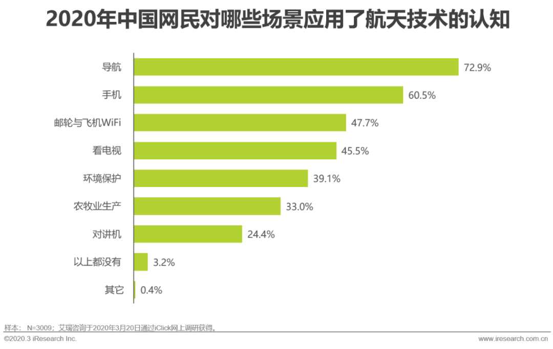 如上文所述,技术这个词对航天人和对普通人来说,是具有不同含义的两种概念。所以完全抛开航天专业性从普通用户的视角审视,他们在意的关键点在航天人眼里就会非常基础。在我们列举的所有场景中,其实所有这些日常生活中的场景,均使用了航天技术,或在某一个关键环节直接由卫星提供服务,但除了导航与手机以外,其余场景用户的感知度都没有超过50%。