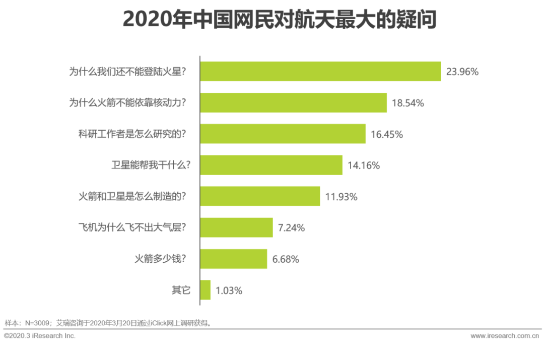 而网民对航天产业最大的疑问,则更加充分的体现出航天科普的重要性。不同于当下航天企业重要技术突破对外呈现的专业化的内容,登陆火星被看作航天的一个里程碑,所以相较于其它,它是更加宏伟的一个目标。以登陆火星为主旨的一系列知识补充,都能很好的激发用户对于航天的兴趣。