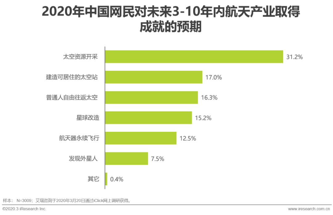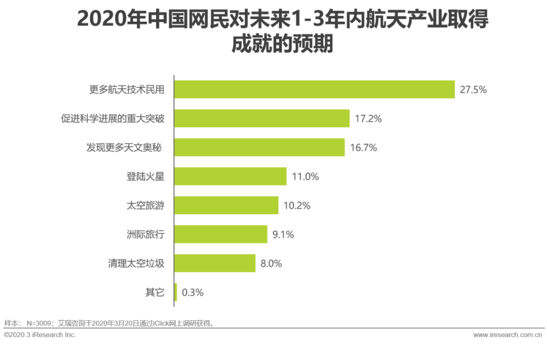 这样的预期对于航天产业来说是机遇:一方面,配合前文的调研结论,航天产业可以非常明确的找到宏伟的目标,然后实现这些目标的路径及方法,就是针对用户最大疑问而进行的最好解答;另一方面,历史上推动航天发展的主要因素是政治需求,经验证明这种动力既不持久也不稳定,而航天的普惠化,势必将发展航天的主要动力从政治转为社会愿望。而这一点在之后的调研结论中,尤其重要。