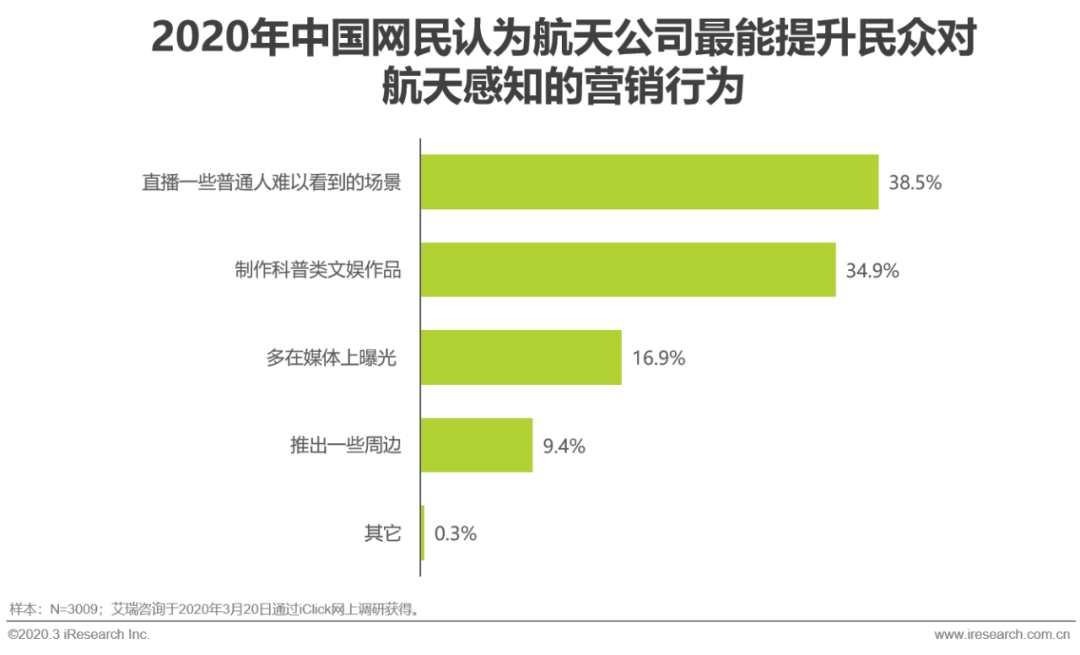 对航天产业来说,这种概念替换是一个长期的过程,38.5%的用户认为目前最能提升民众对航天感知的行为是直播火箭升空、科研过程和宇宙生活的画面。长期束之高阁后,眼见为实是打开局面的良好起始。