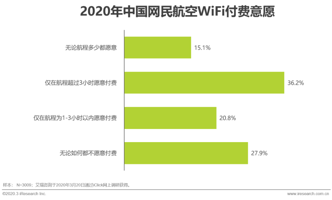 当航程在3小时以内时,有35%左右的用户原因为航空WiFi付费。而当航程超过3小时后,愿意付费用户的比例飙升到了70%以上。