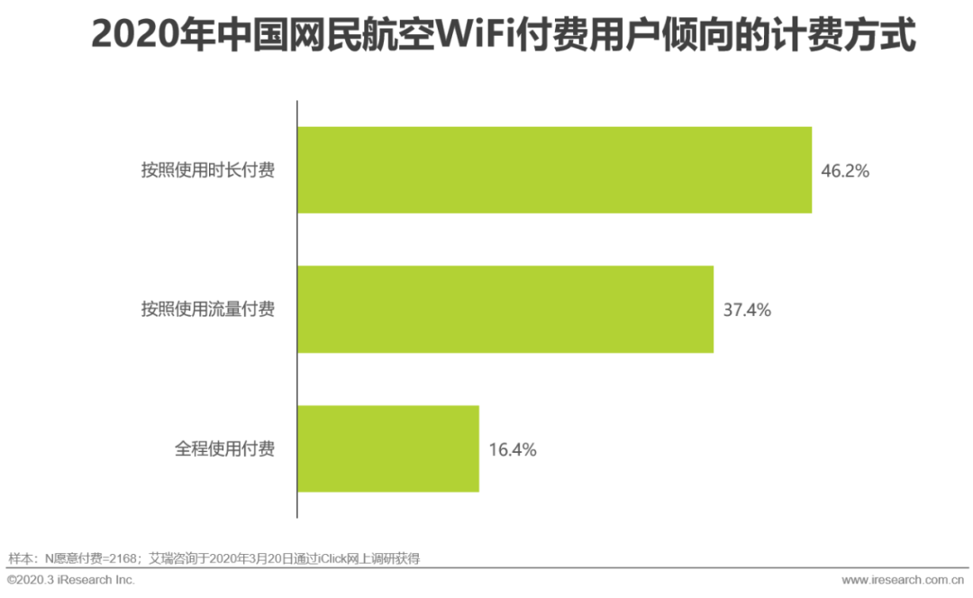 这说明,中国网民具备基础的付费意愿,有助于航司从劣质的免费航空WiFi服务向优质的收费服务过渡。多数用户倾向的航空WiFi付费方式是按使用时长计费,比例为46.2%;同时倾向于按照使用流量付费的比例也达到了37.4%。