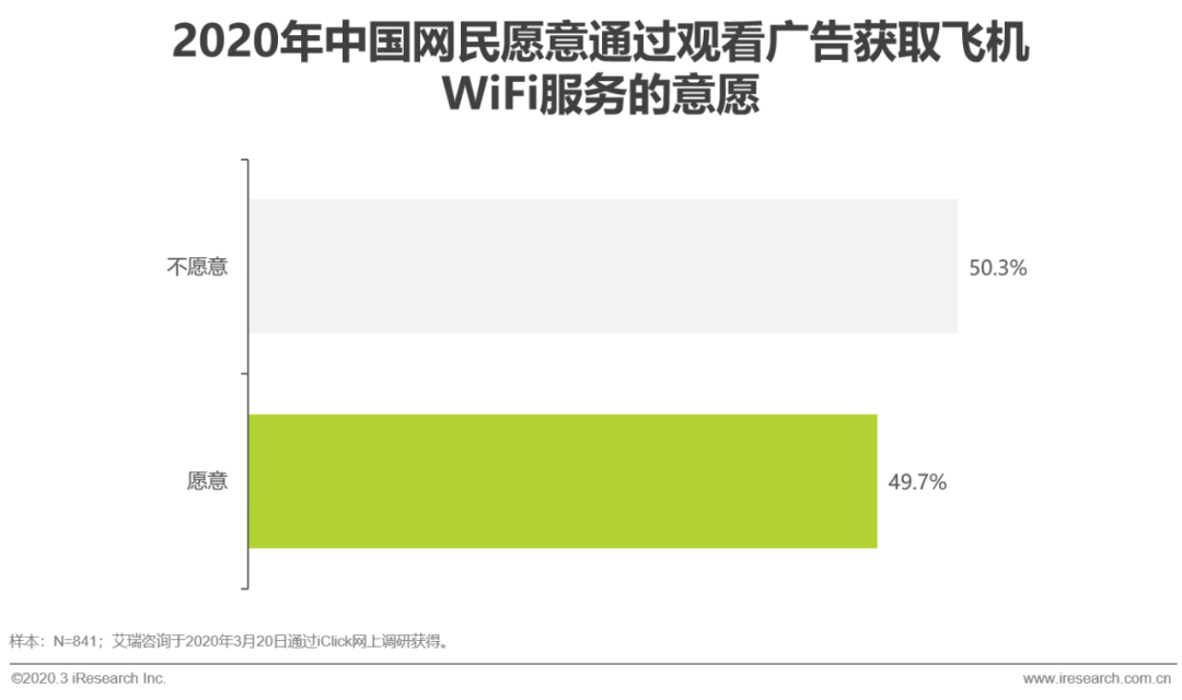 在所有不愿意为航空WiFi付费的用户中,有49.7%的人表示愿意通过观看广告来获取航空WiFi服务。这一比例偏低的原因并非飞机WiFi不重要,而是目前环境下,即便在飞机上上网,网速、服务内容等情况对用户来说也没有太大吸引力。当机上联网已经成为必需品时,这一比例会骤然提高。