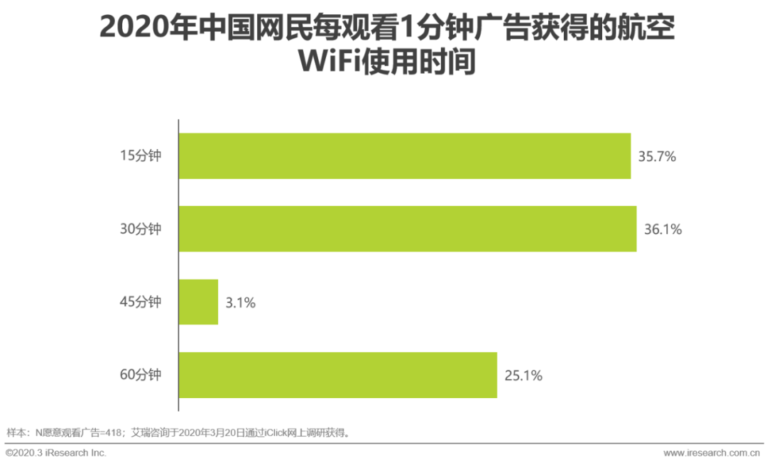 观看1分钟广告后,超过70%的用户认为他们可以获得30分钟以下的航空WiFi使用时间,按照前文按时间付费标准的平均数,每小时航空WiFi大概价值7.95元,所以理论上每1分钟的广告价值4元左右。除了上文提到的收费模式,航空公司可以采取向广告主收费的策略,并根据此标准评估定价。