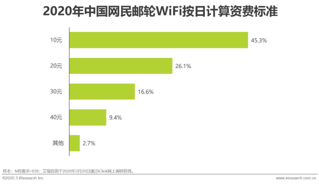 海洋是地面移动互联网无法覆盖的领域,原因时地面移动互联网的实现方式是依靠主干线+基站的方式,而海洋环境中无法搭建基站,所以在海洋中船舶进行通信时只能依靠卫星。但是鉴于邮轮本身的局限性和数量,邮轮WiFi的市场空间并没有航空WiFi大。虽然用户对邮轮WiFi的需求比飞机强烈,但是定价也更为敏感。超过20元的定价将流失近一半的用户。这也从另一个侧面说明,当应用环境丰富以后,用户服务场景间的断层将被拉平,这时用户对流量价格的敏感性就会得到凸显。