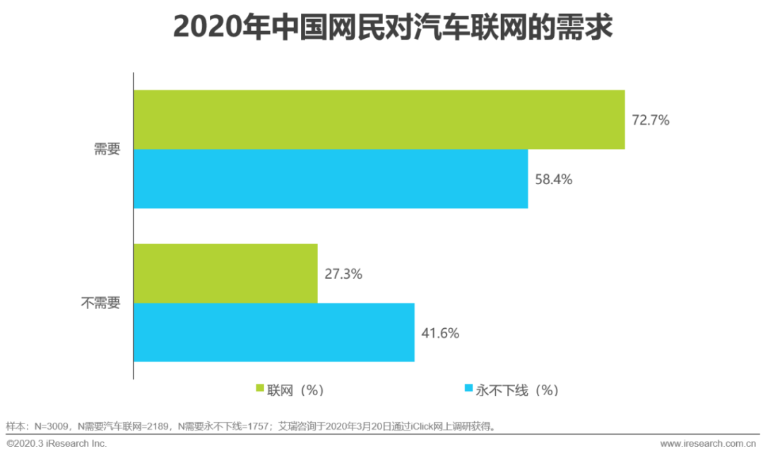 调研结果显示,72.7%的被访者认为汽车联网很有必要,然而对于“永不下线”有需求的仅有58.4%。一方面是因为国内的地面通信设施能够覆盖绝大部分用户日常出行的区域,另一方面由于国内网联汽车的渗透率很低,用户并没有对汽车联网这一功能产生依赖,自然认为汽车不需要具有“永不下线”的功能。