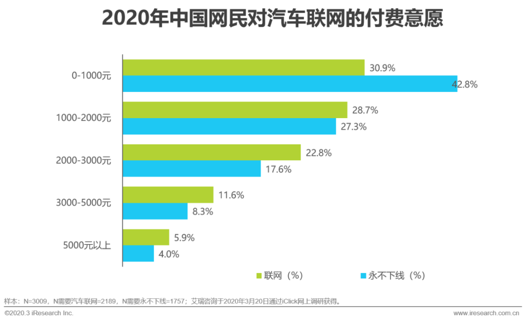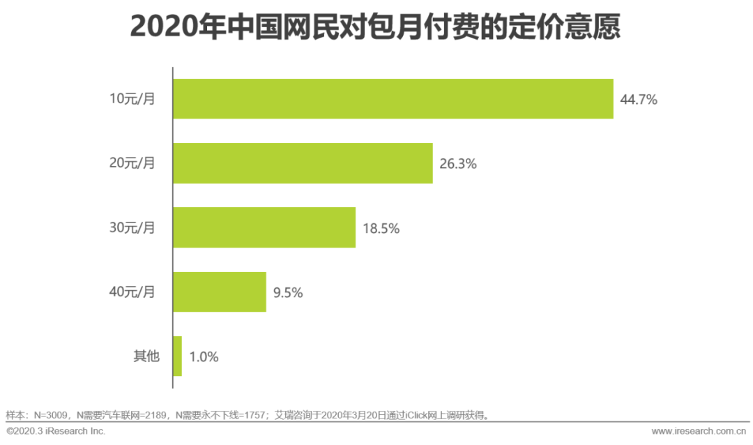 汽车联网对于用户来说,尽管可能涉及卫星,但依然与“上网”极大相关。所以用户会本能的将日常已经形成的概念和消费习惯映射到新生事物上。包月付费和20元以下包月费用的用户占比都比较高。所以当某项技术实现的功能与日常生活中的固有设施息息相关或极大雷同时,就不能以技术本位和公司运营成本本位的思考模式来定价。