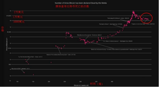 从2010年开始,各大媒体以及部分社会知名人士就陆续给加密货币领域传来比特币讣告。比特币被各国政府盯上的时候,他们大喊归零;比特币价格持续走高的时候,他们警惕世人那是郁金香泡沫;比特币出现黑天鹅事件的时候,他们再次叫嚣比特币没有任何价值。但自比特币披萨事件第一次为其赋予价值以来,比特币的死亡和归零就仅仅是活在媒体的嘴里了;而且有趣的是,比特币的知名度与曝光度越高,媒体宣告其死亡的次数就越多。