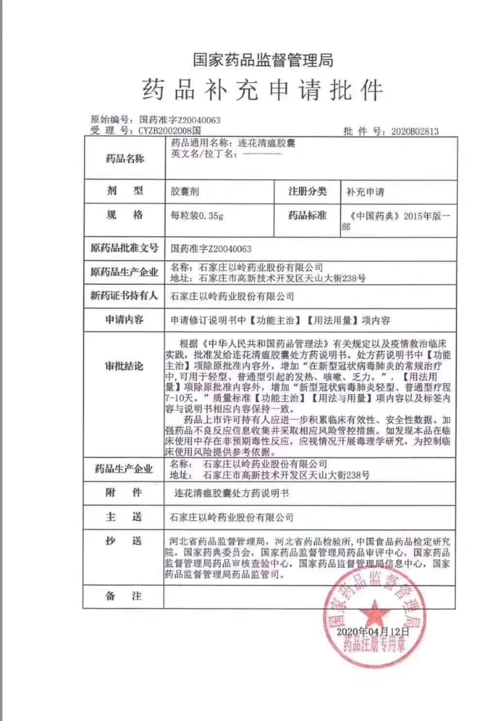 前一日晚间,一份印有国家药品监督管理局印章的《国家药品监督管理局药品补充申请批件》流出。根据该批件,莲花清瘟胶囊用于新冠肺炎的审批结论为“根据《中华人民共和国药品管理法》有关规定以及疫情救治临床实践,批准发给连花清瘟胶囊处方药说明书,处方药说明书中【功能主治】项除原批准内容外,增加“在新型冠状病毒肺炎的常规治疗中,可用于轻型、普通型引起的发热、咳嗽、乏力。”
