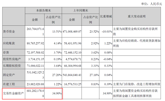 此外,从公司财报里,我们也能看出全聚德经营不善的种种迹象。从2019年半年报来看,公司的资产构成似乎与一般的工商业企业很不一样。交易性金融资产占总资产的比例高达35%,公司解释称是闲置资金购买结构性存款所致。