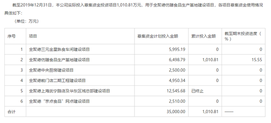 然而,直到6年后的2020年3月7日,公司公告称,以上6大项目除仿膳食品生产基地进度为15.55%之外,其他项目进度均为0或已终止。