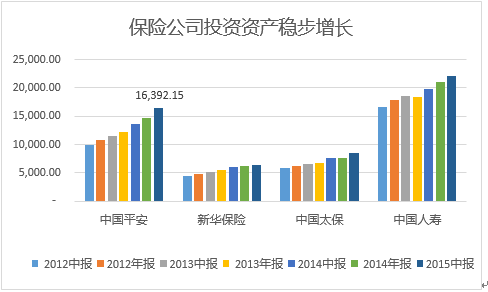 与净利润保持增速同步的是保险公司的总资产。中国平安(601318.SH)1-9月份总资产相比上年增长了20.93%,达到4.67万亿。增速较慢的中国人寿(601628.SH),1-9月份总资产同比也增长了8.24%。与总资产的增长同步,保险公司投资资产保持稳步上升态势,如下图: