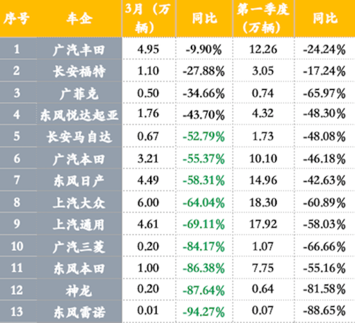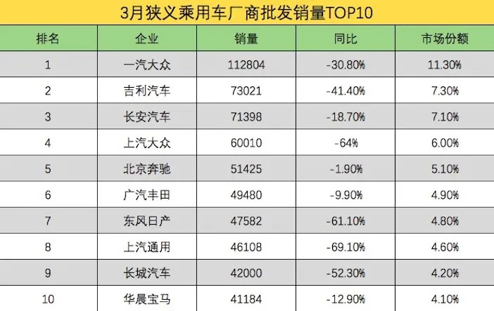 与大部分合资品牌同比销量普遍暴跌的情况(见下表)相比,北京奔驰和华晨宝马的同比跌幅收窄不少。尤其是北京奔驰,其3月批发销量几乎与去年同期持平,市场向高端品牌聚集的信号十分明显。