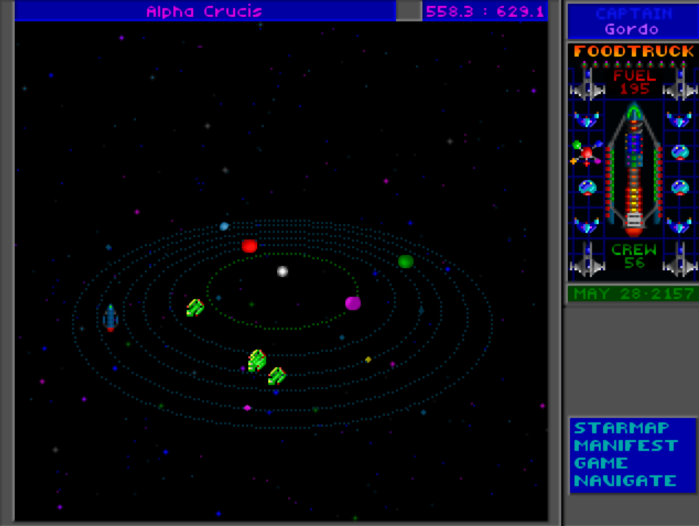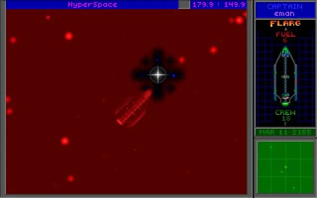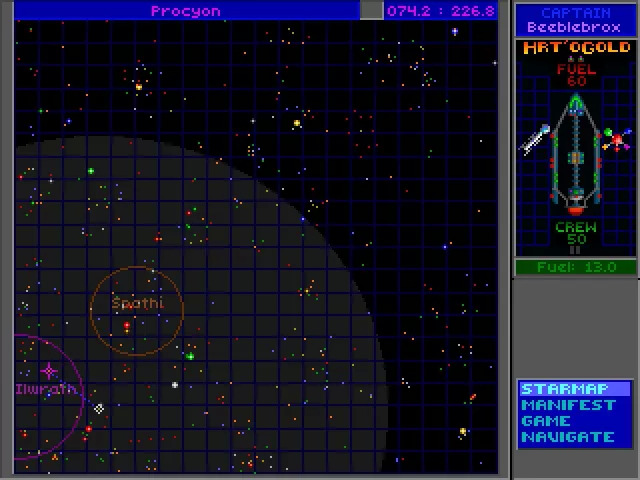 在超空间内抵达一个恒星系后,就会进入星系探索模式。星系探索时带有一点早期太空模拟游戏的味道,玩家需要在类似《月球冒险》和《爆破彗星》飞行时模拟的那种“惯性干扰”下准确登陆想要拜访的行星。在没有敌对飞船的时候自然可以放心飞行,代价只是多一些时间和燃料消耗,但是在进入敌对势力占领的星系后,格外注意飞行路线才能避免不必要的麻烦。