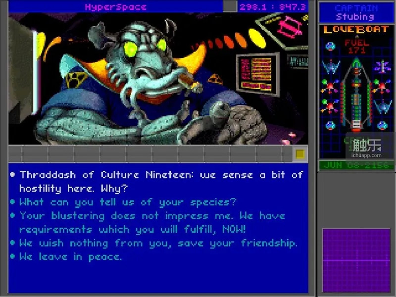 尽管《星际控制2》本质上是个太空冒险类游戏,但游戏中出色的RPG成分却获得了许多好评。在今天回看《星际控制2》的RPG部分,精心设计的对话系统和充满(黑色)幽默的对话内容非常饱满,甚至与20多年后的3A级RPG相比时也能平分秋色。游戏中的对话没有各种“括号中的提示”来告诉玩家选择的后果。如果不能根据对方的性格和脾气随机应变,小则友谊翻船,大则直接开战。体验这些模块化叙事构建出的剧情,玩家一可以获得完成主线任务所需要的线索,二可以对支线剧情做出不同选择,使游戏的重复可玩性大大增加。