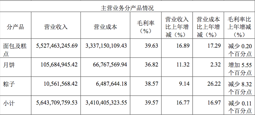 分产品来看,面包及糕点类在2019年卖出了55.28亿元,较上年同期增长16.89%,毛利率39.63%,较上年同期下滑0.2%;月饼实现营收1.06亿元,较上年同期增长11.32%,毛利率36.82%,较上年同期增长5.55%;粽子实现营收1056.16万元,较上年同期增长9.14%,毛利率达38.57%,较上年同期下滑8.32%。