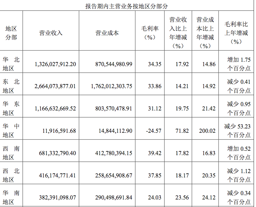 分地区来看,东北地区占公司营收比重接近一半,实现营收26.64亿元,东北地区经销商数量为244家,同比增加21家。此外,华北地区实现营收13.26亿元,华东地区实现营收11.67亿元,华北地区经销商数量128家,同比减少2家,均为公司销售重点。